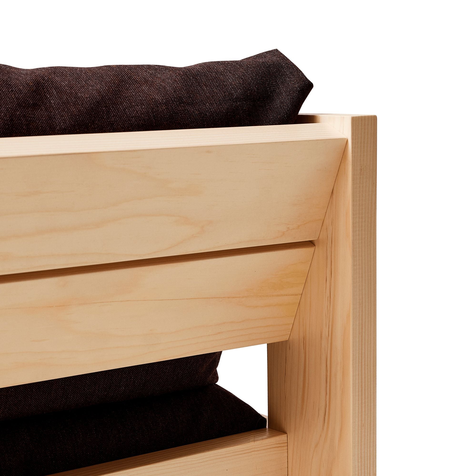 Vankka mäntyrunko ympäröi pehmusteet reilulla syvyydellä, jolloin sekä selkä- että istuintyynyt asettuvat puoliksi rungon sisään ilman erillisiä tukirakenteita – ne pysyvät paikoillaan täydellisesti rakenteen tasapainon ansiosta.