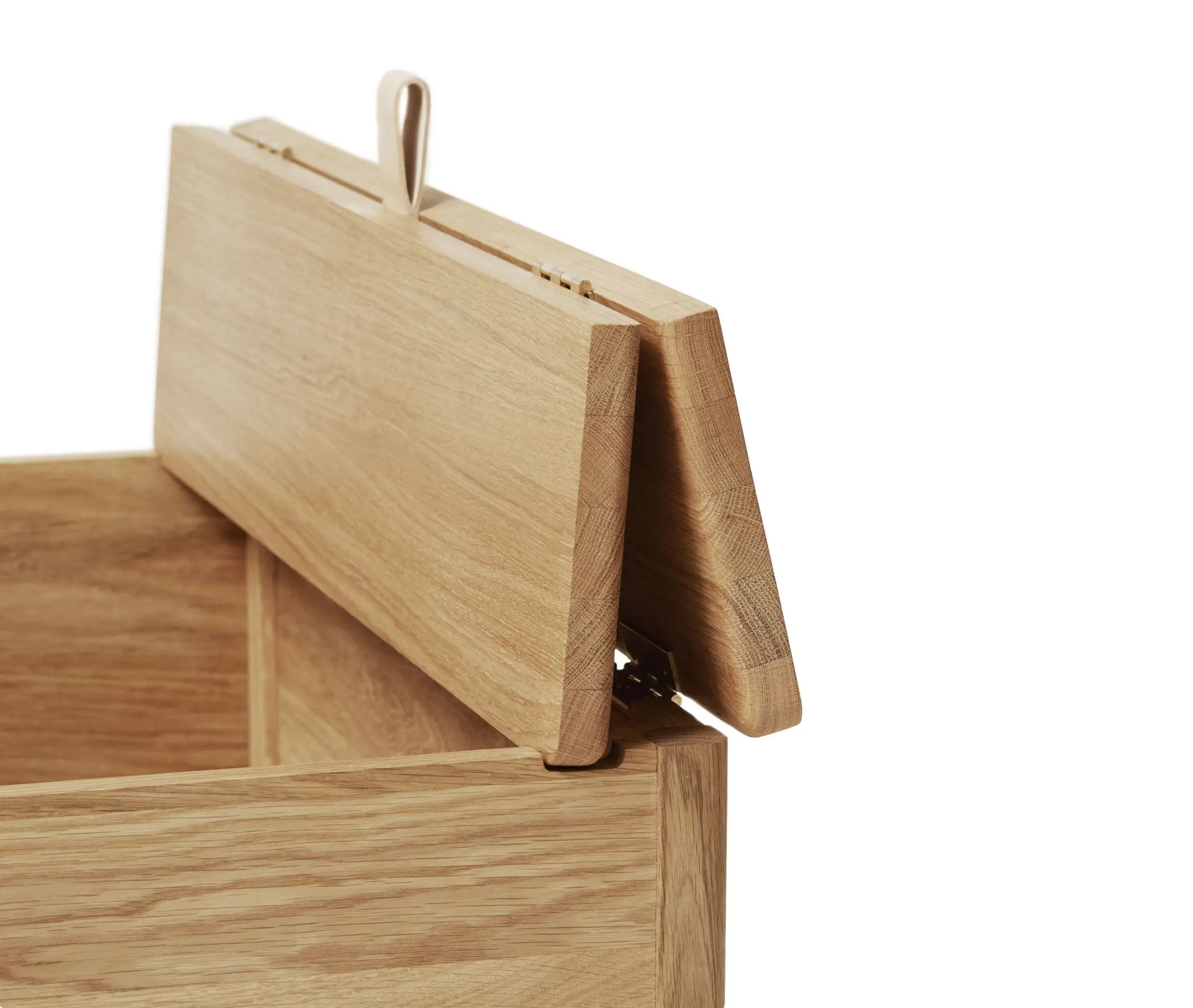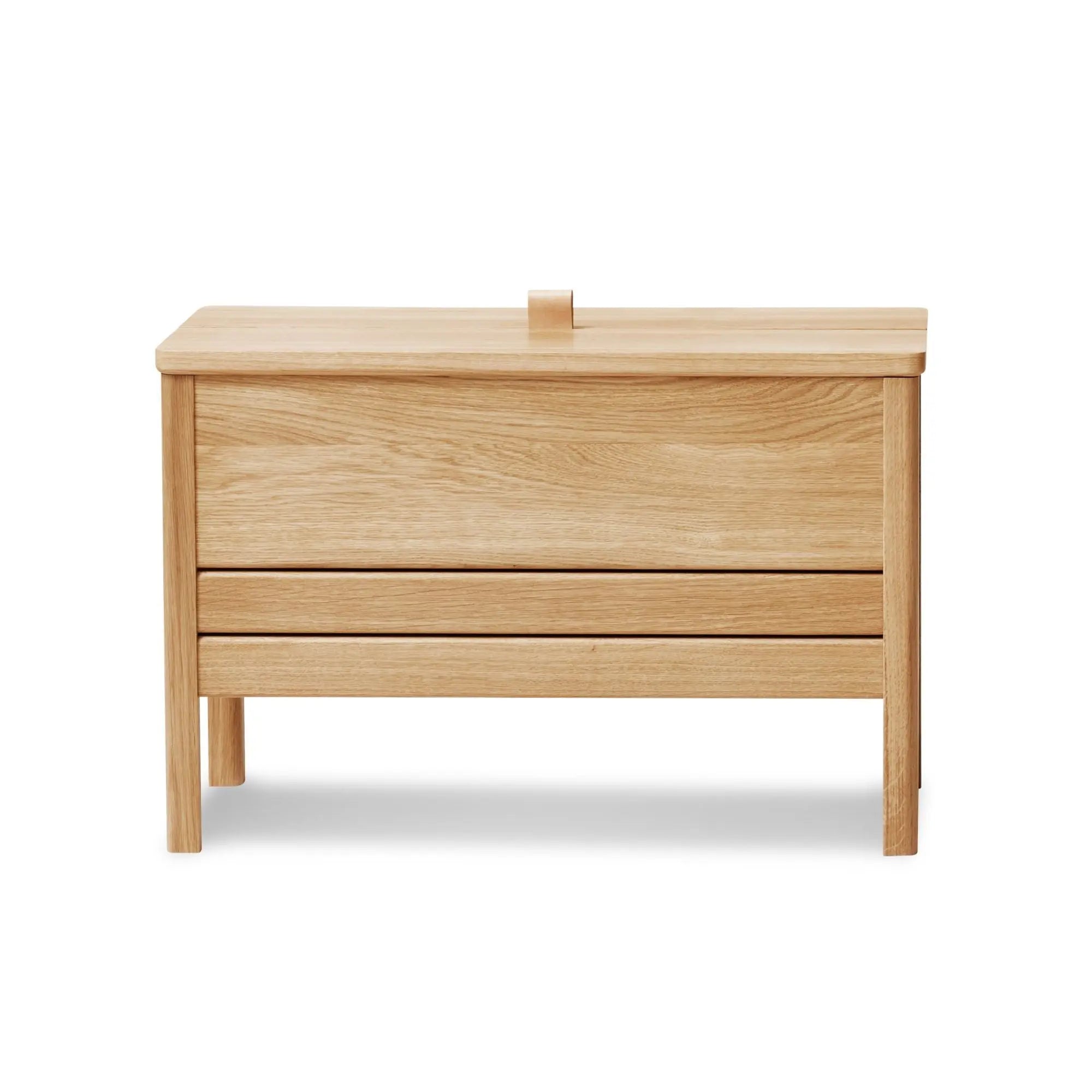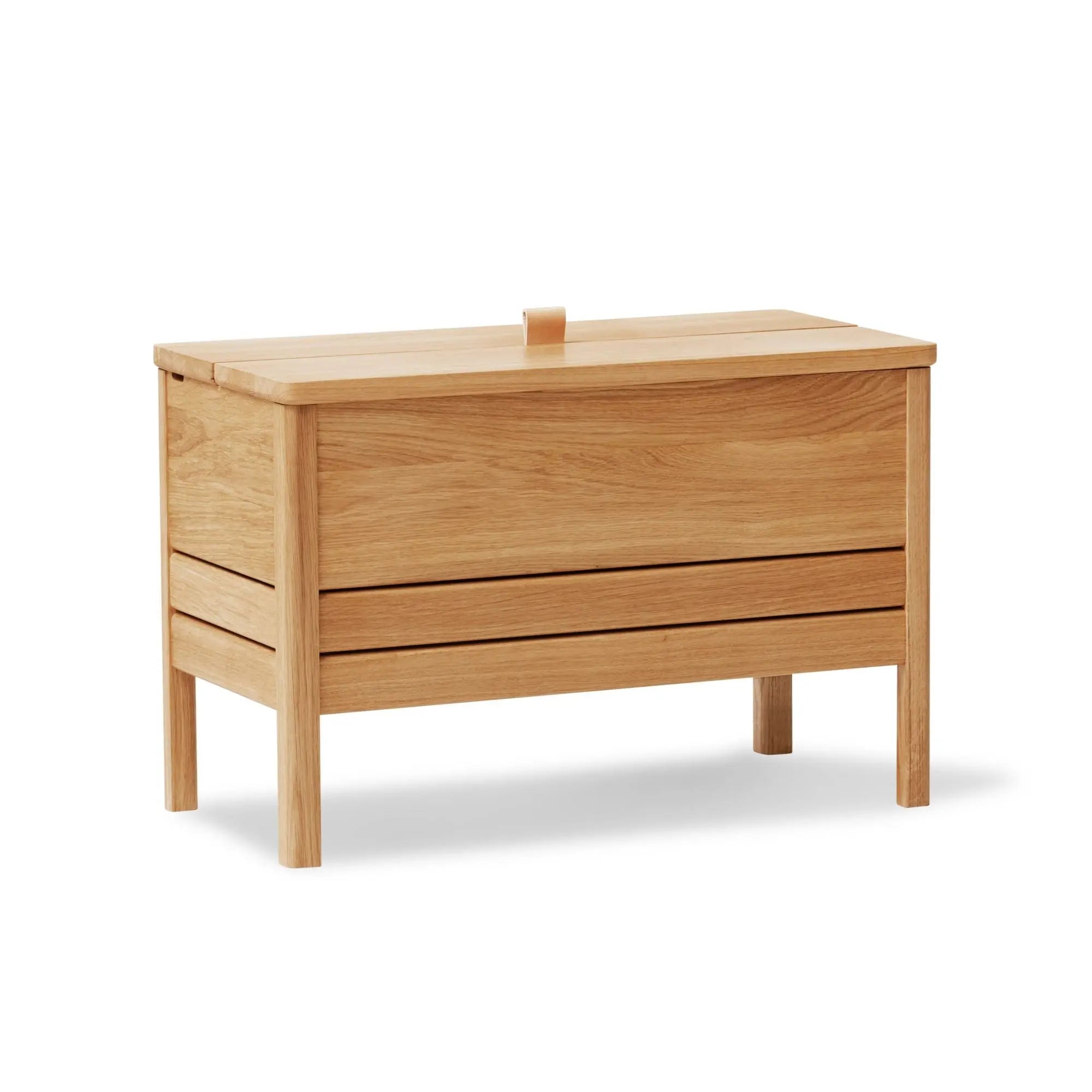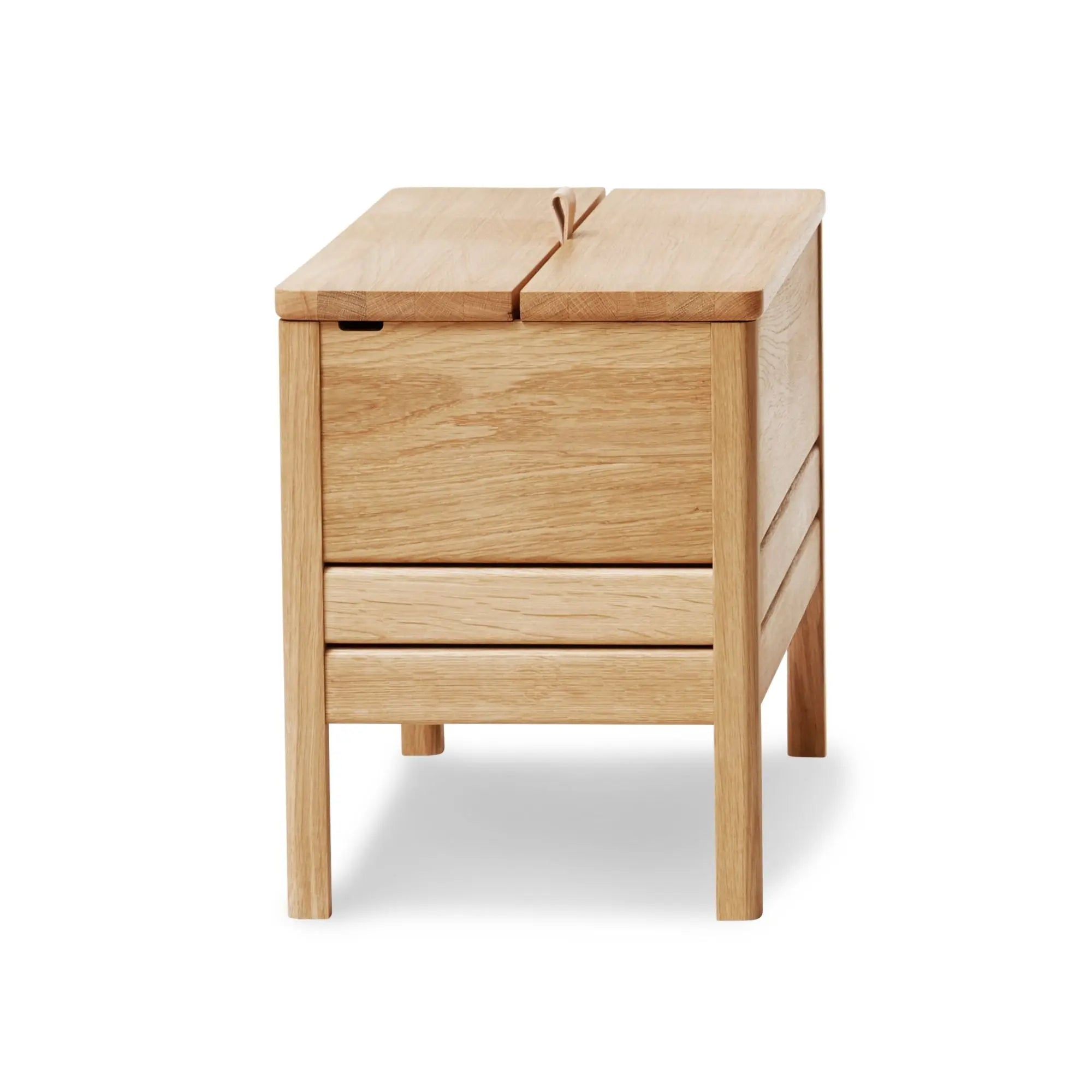 Form & Refinelle ominaisesti myös A Line säilytyspenkillä on useampi käyttötarkoitus. Käytännöllisen penkin kannen voi nostaa kevyesti ylös nahkalenkin avulla. Kalusteen kekseliäs rakenne varmistaa, että kansi pysyy avoinna turvallisesti ja vaivattomasti käytön aikana. Kansi on myös helppo laittaa takaisin kiinni, kun sen aika on.