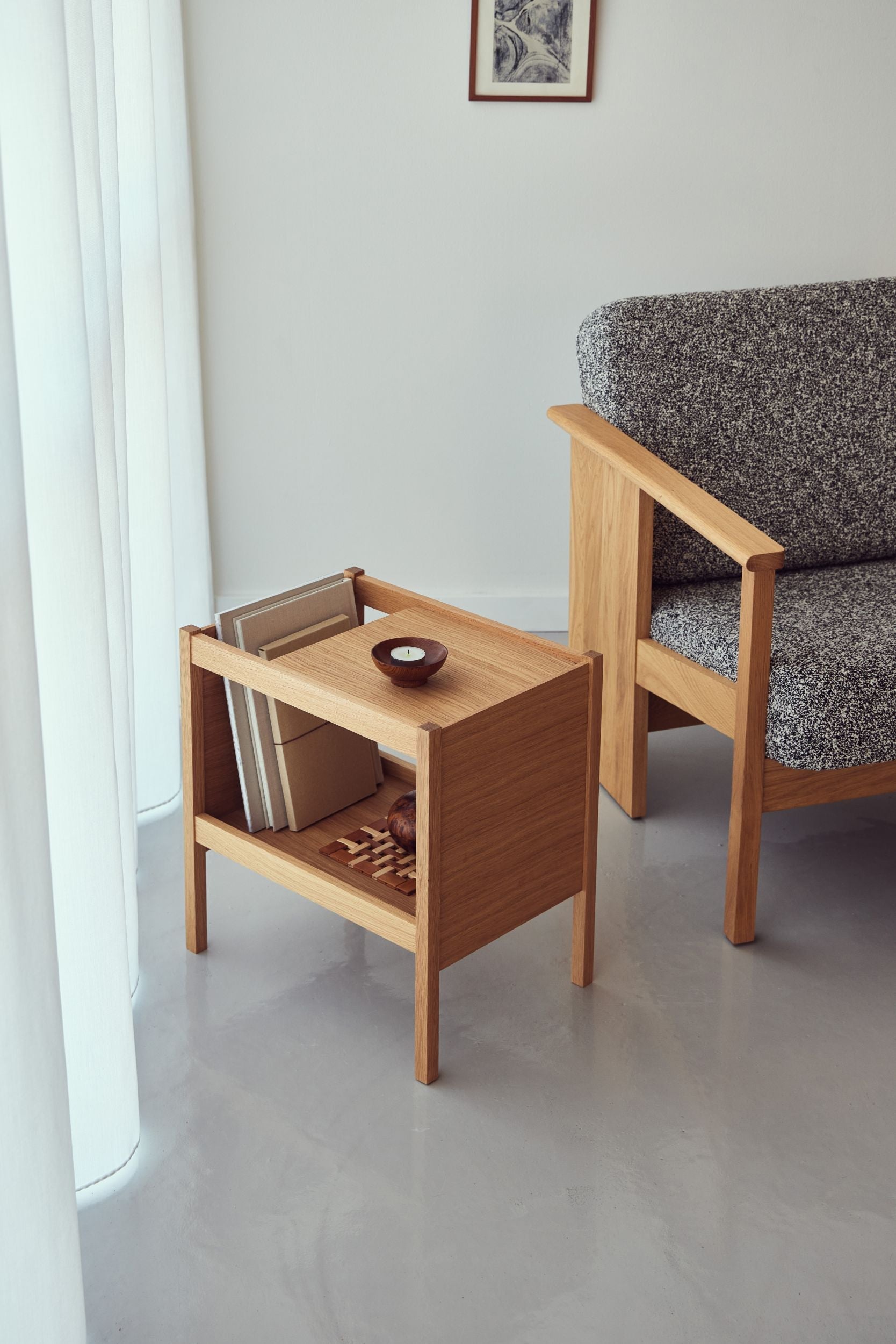 The table is carefully sized to suit a variety of uses and environments, for example as a coffee table, magazine rack, side table or bedside table.