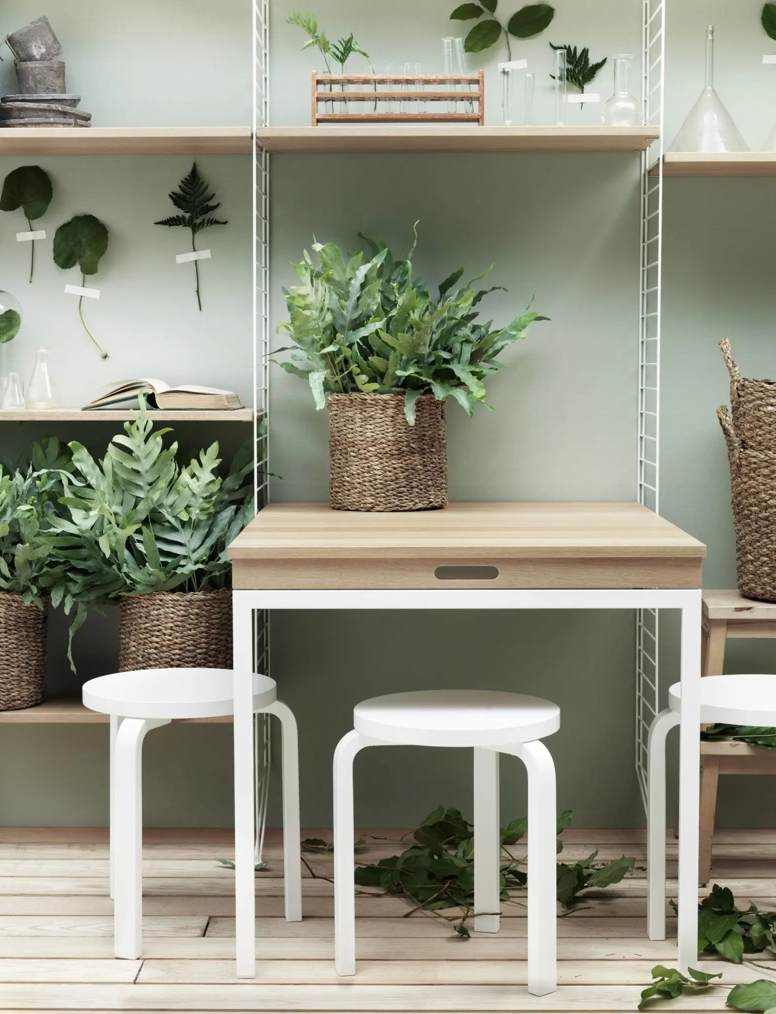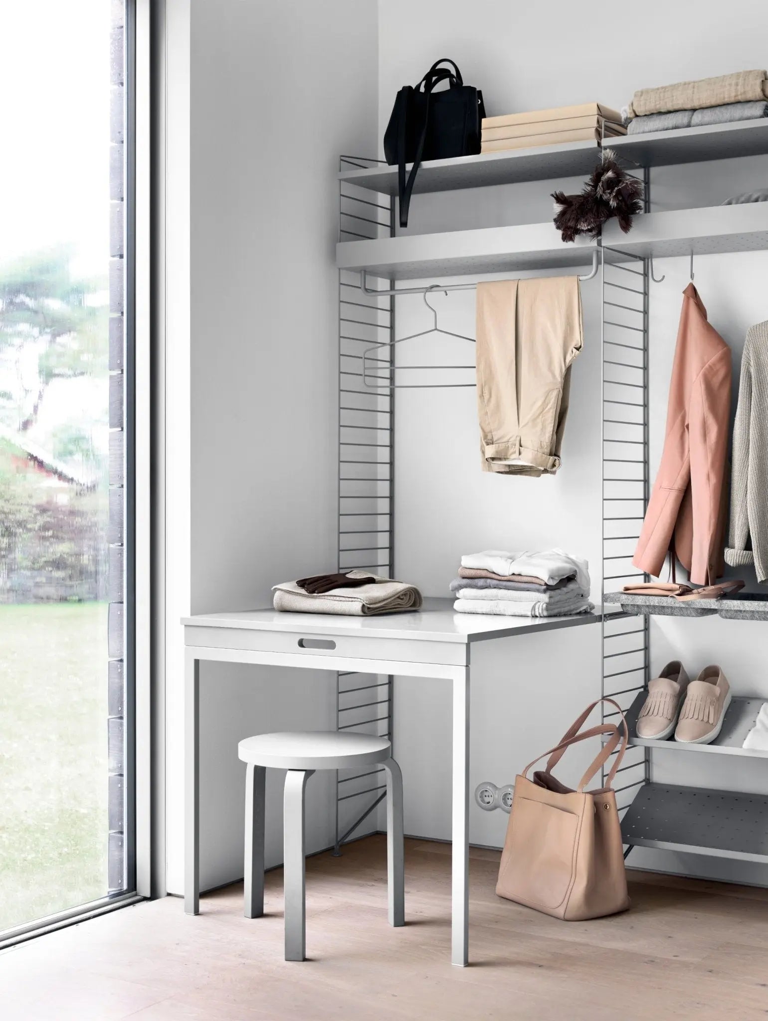 Additional information: Clasp table to be attached to String floor panels. Table load capacity max. 50 kg objects spread evenly. The load capacity of the shelf at the back of the tabletop max. 15 kg.