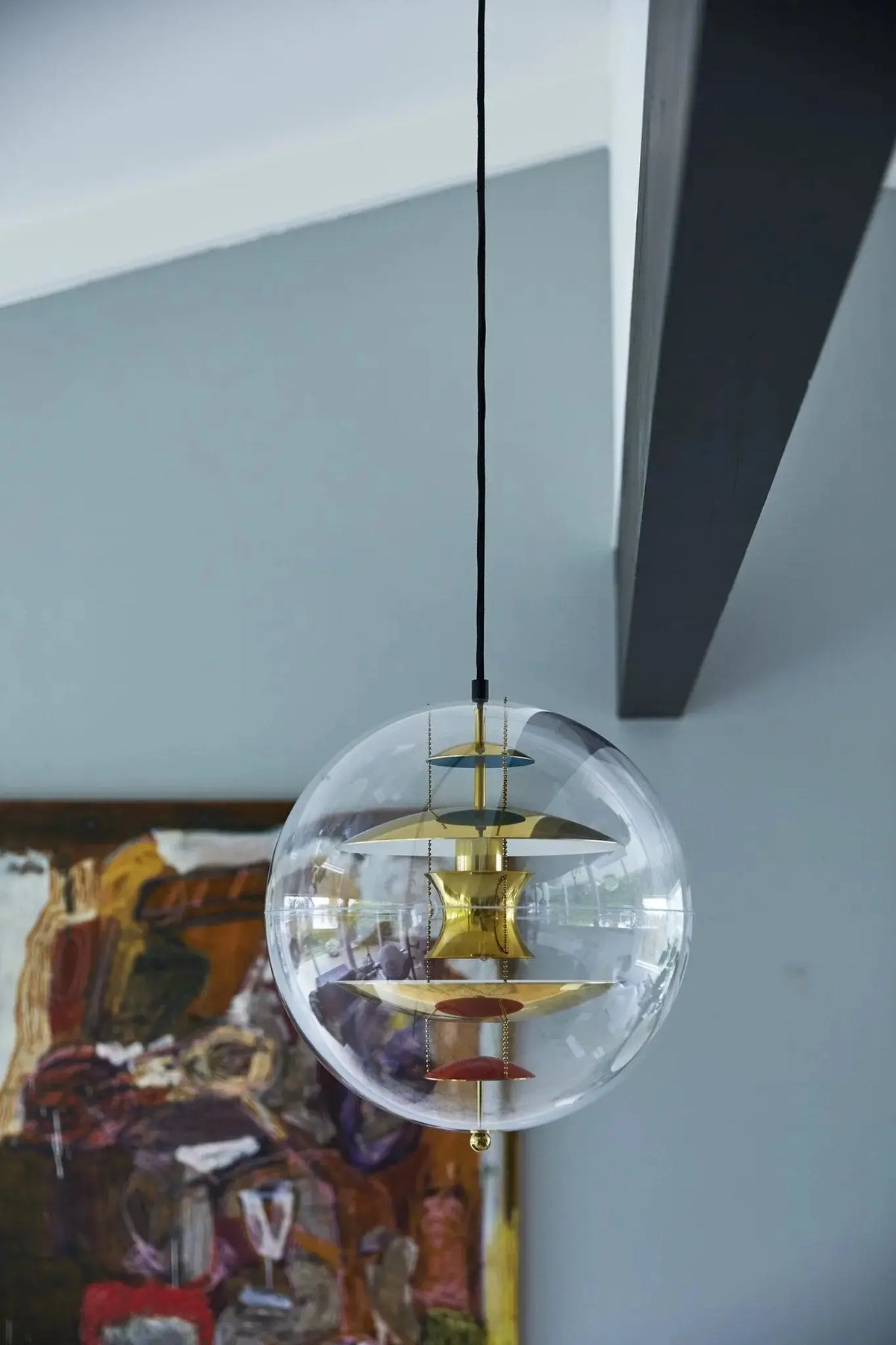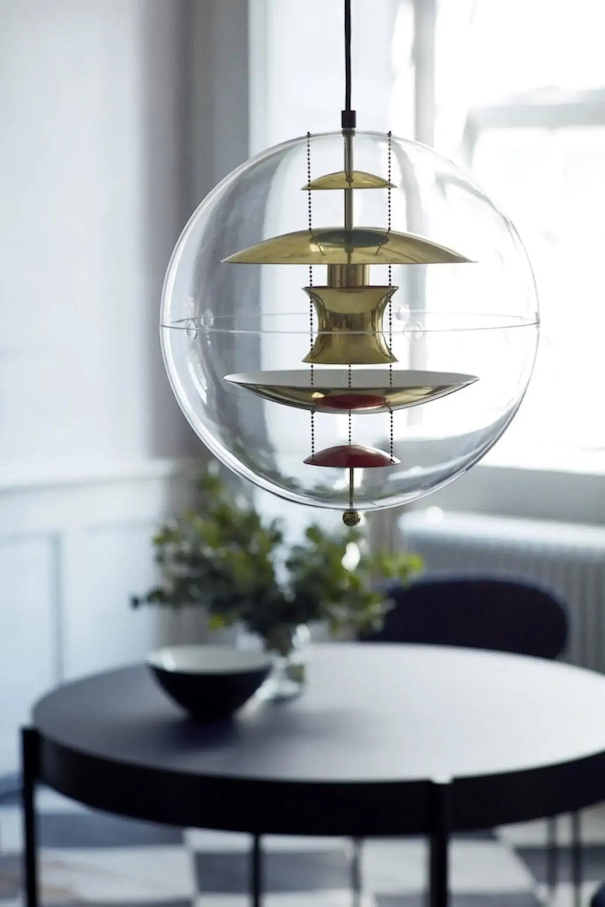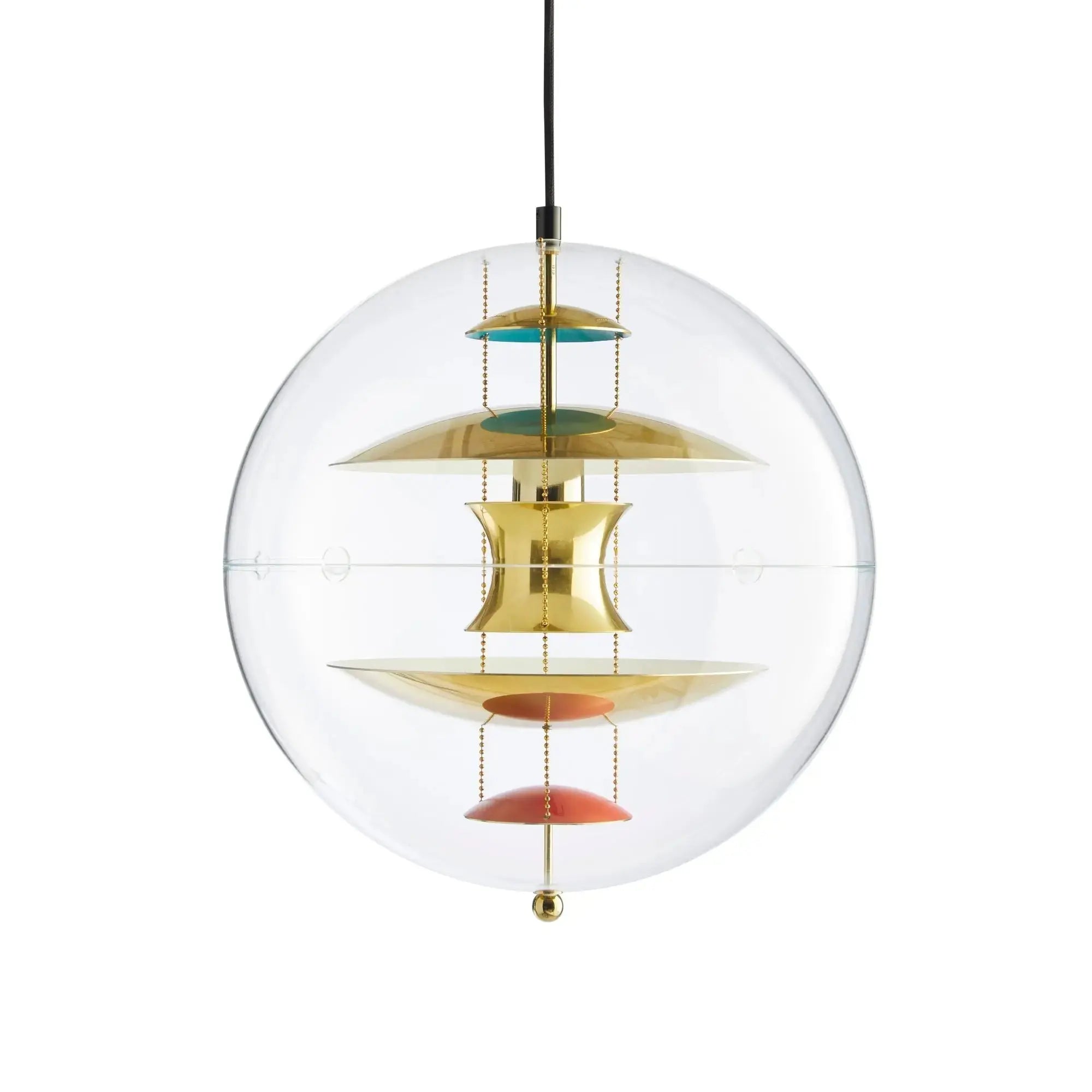The Verpan VP Globe 40 is an iconic pendant light designed by Danish designer Verner Panton, representing modern and futuristic design. The lamp consists of a clear acrylic globe with five metal and colored reflectors inside. These reflectors are arranged at different levels, creating an interesting light effect that reflects light beautifully and produces a soft, warm glow.