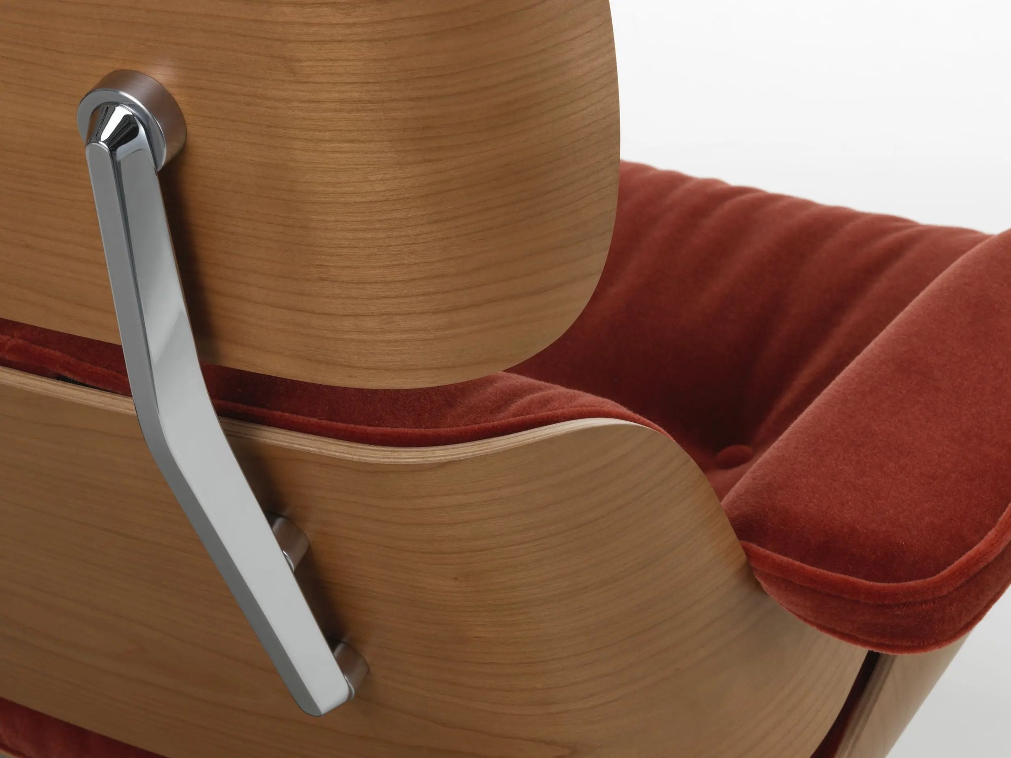 Material: Molded cherry plywood, fabric upholstery, polished aluminum, water-based lacquer