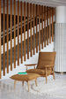 Materiaali: Runko vaneria ja massiivipuuta, istuinosassa metallirunko, pehmusteena vaahtomuovi ja Zig Zag-jouset, jalat ja käsinojat saarnia tai tammea.