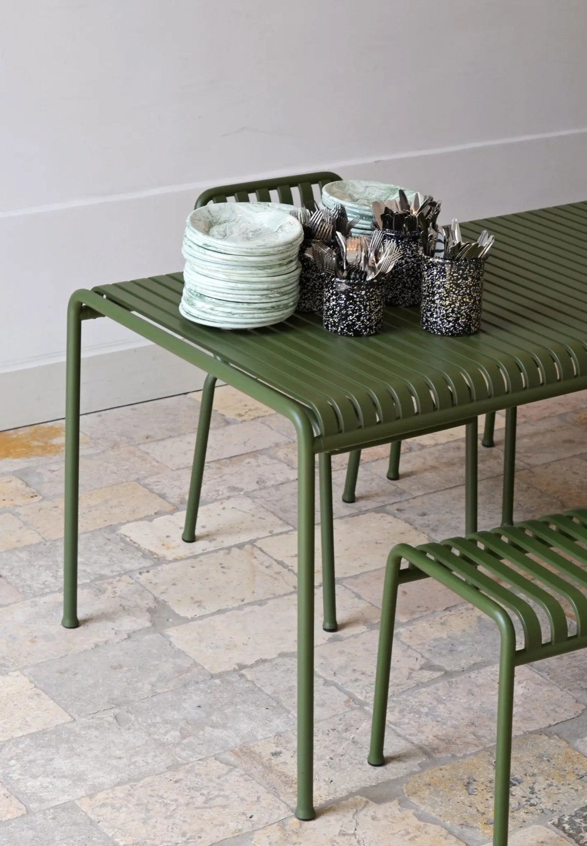 Hay Palissade -kalustesarja sisältää useita ulkokäyttöön tarkoitettuja huonekaluja. Hay on tanskalainen huonekaluvalmistaja, joka tunnetaan minimalistisesta ja skandinaavisesta muotoilusta. HAY Palissade penkki toimii kauniisti sellaisenaan tai osana ruokailuryhmää. Pelkistetyn penkin pehmeälinjainen muotoilu sekä tukeva rakenne tekevät istumiskokemuksesta miellyttävän. Neljällä sirolla teräsjalalla seisova penkki on helppo yhdistää jo olemassa olevien terassikalusteiden pariksi tai yhdistää muihin Palissade tuotteisiin. HAY Palissade -sarja tarjoaa monipuolisesti vaihtoehtoja parvekkeelle, terassille ja puutarhaan. Kahviloista tuttua ajatonta kestävyyttä henkivät Palissade-tuotteet on valmistettu jauhemaalatusta teräksestä, joka mahdollistaa tuotteen monipuolisen sijoittelun sekä helppohoitoisuuden.